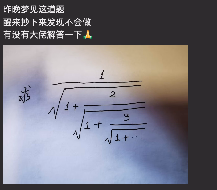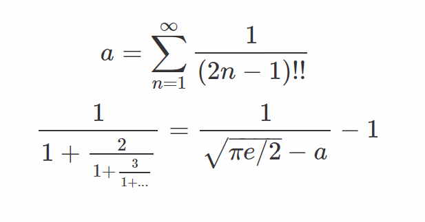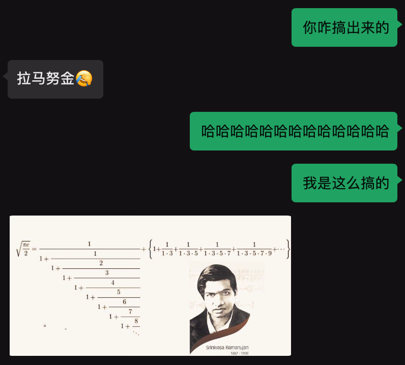 哈哈哈哈拉马努金也不过如此(doge)。这个式子怎么证明还不知道,但是此时我已经凌晨好几点了,打工人还要早起上班,于是我就去睡觉了。