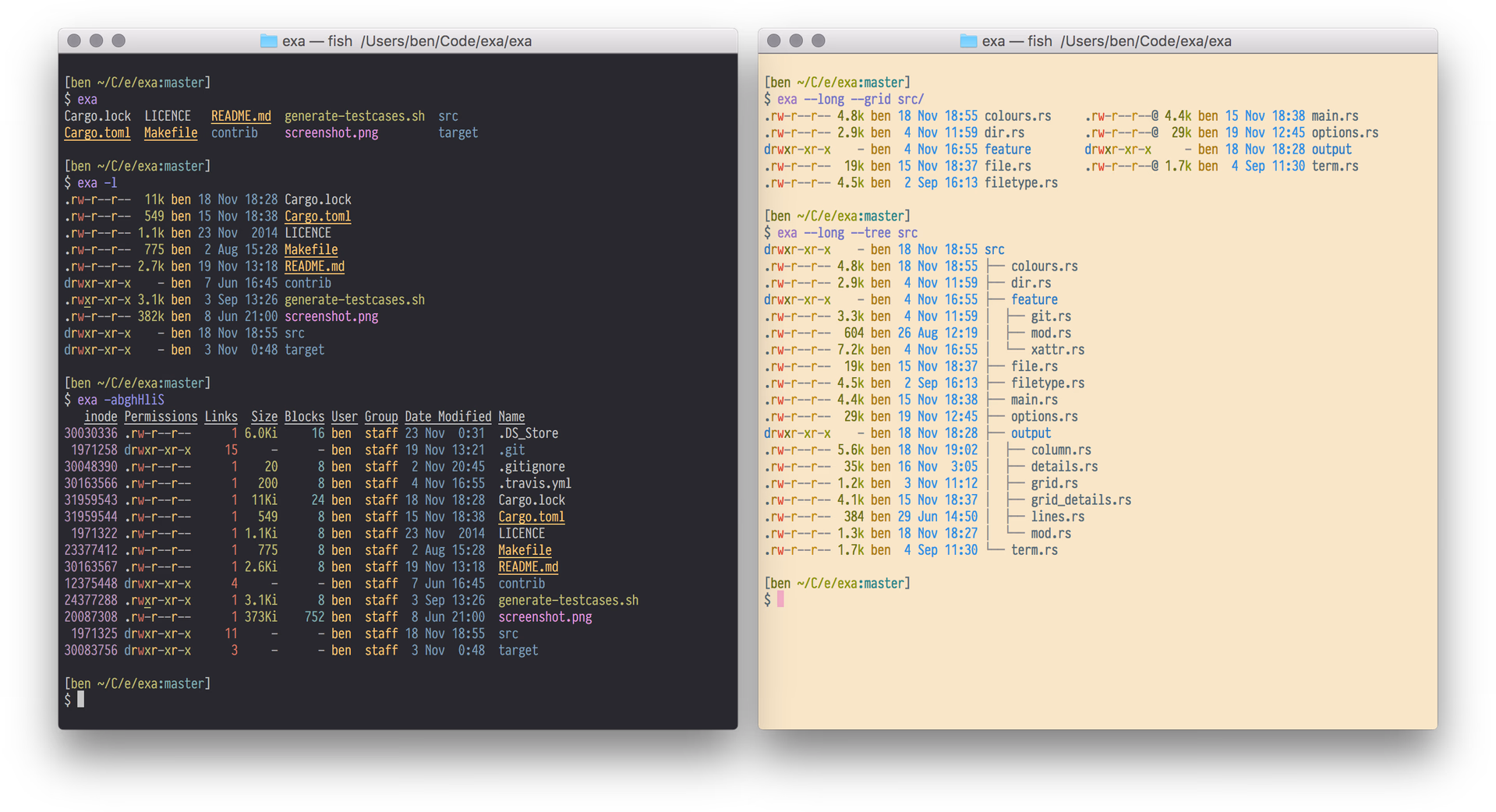 两者都是 Rust 写的。恭喜 exa,荣登我花里胡哨排行榜第三名!说起来我一开始在学校服务器上跑不起 exa,提示 glibc 版本不行,但我显然没有权利改 glibc 这么基础的东西。后来用了 musl 版的 exa 后终于跑起来了。下面放一张 exa 的图: