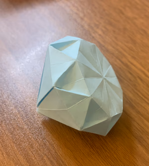 然后介绍一下 Thomas Hull,Western New England University 一个搞折纸的 Associate Professor。我之前引用的那个五个相交四面体的教程就是他的,我猜这个组装结构是他原创的(模块应该不是他发现的)。他发现了另外一个模块 PHiZZ,我在 Pinterest 上也看到了一些 PHiZZ 的创作,例如这个,确实很好看,就是 840 这个数字有点劝退……我光是正方体环 144 个模块就做的要死了……