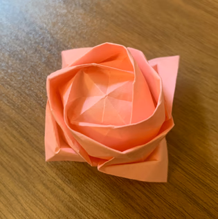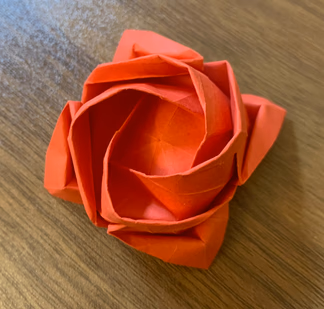 比之前的雍容富贵一些。欧美玫瑰我也看了,但是感觉对纸的要求很高就没搞了(其实更可能是因为懒)。PT 玫瑰的教程里,折了花芯之后,下一步需要把花瓣卷在一起,视频里说“整理”一下,这个“整理”我试了好久才找到一个勉强满意的整理方案,视频里也没说从哪个地方开始卷,哪个地方需要用手戳一戳抚平。最后展开花瓣的时候,我感觉我的纸已经快承受不住了,于是就随便搞了一下糊弄了事了……