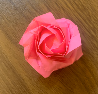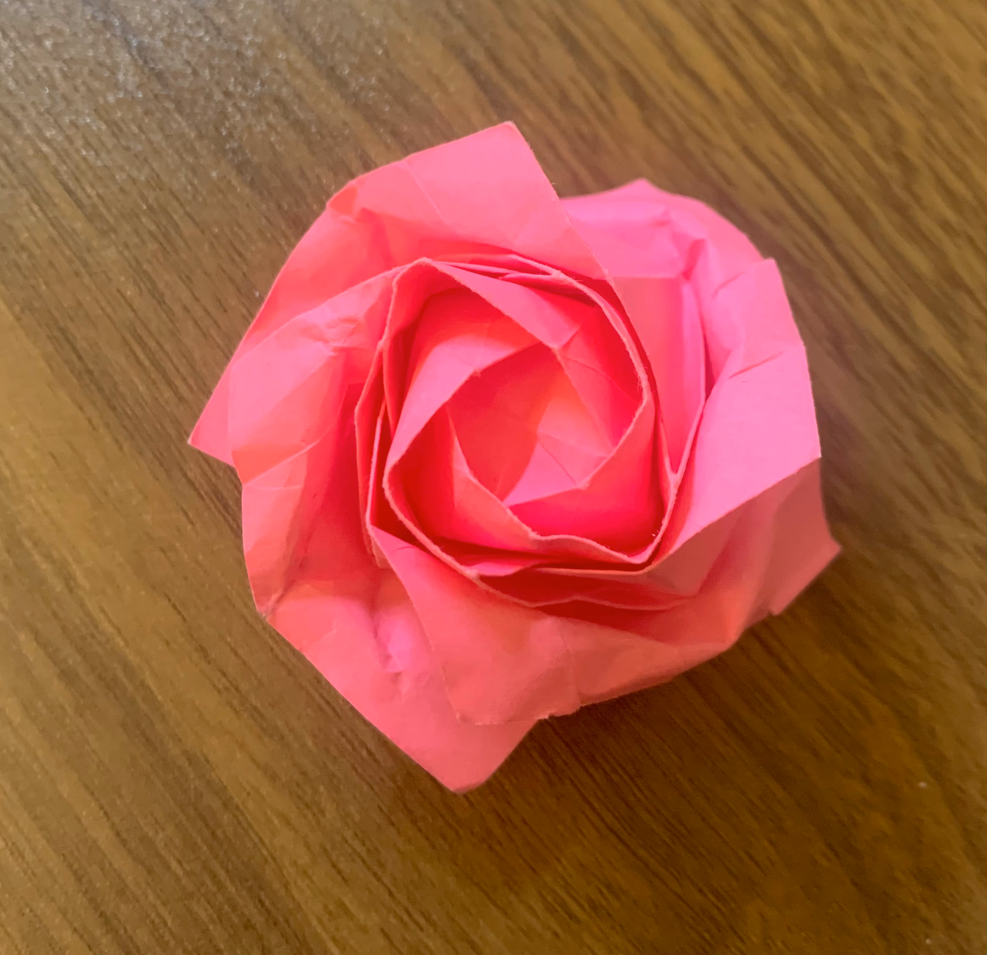 感觉这两个折的一般了……大红的那个是先折的,粉红的那个是第二次折的,把中间的芯弄大了一些。我后来查了一下,纸玫瑰除了川崎玫瑰之外,还有 PT 玫瑰和欧美玫瑰。于是我又去搞了一个 PT 玫瑰,依旧是白叔的教程,效果如下: