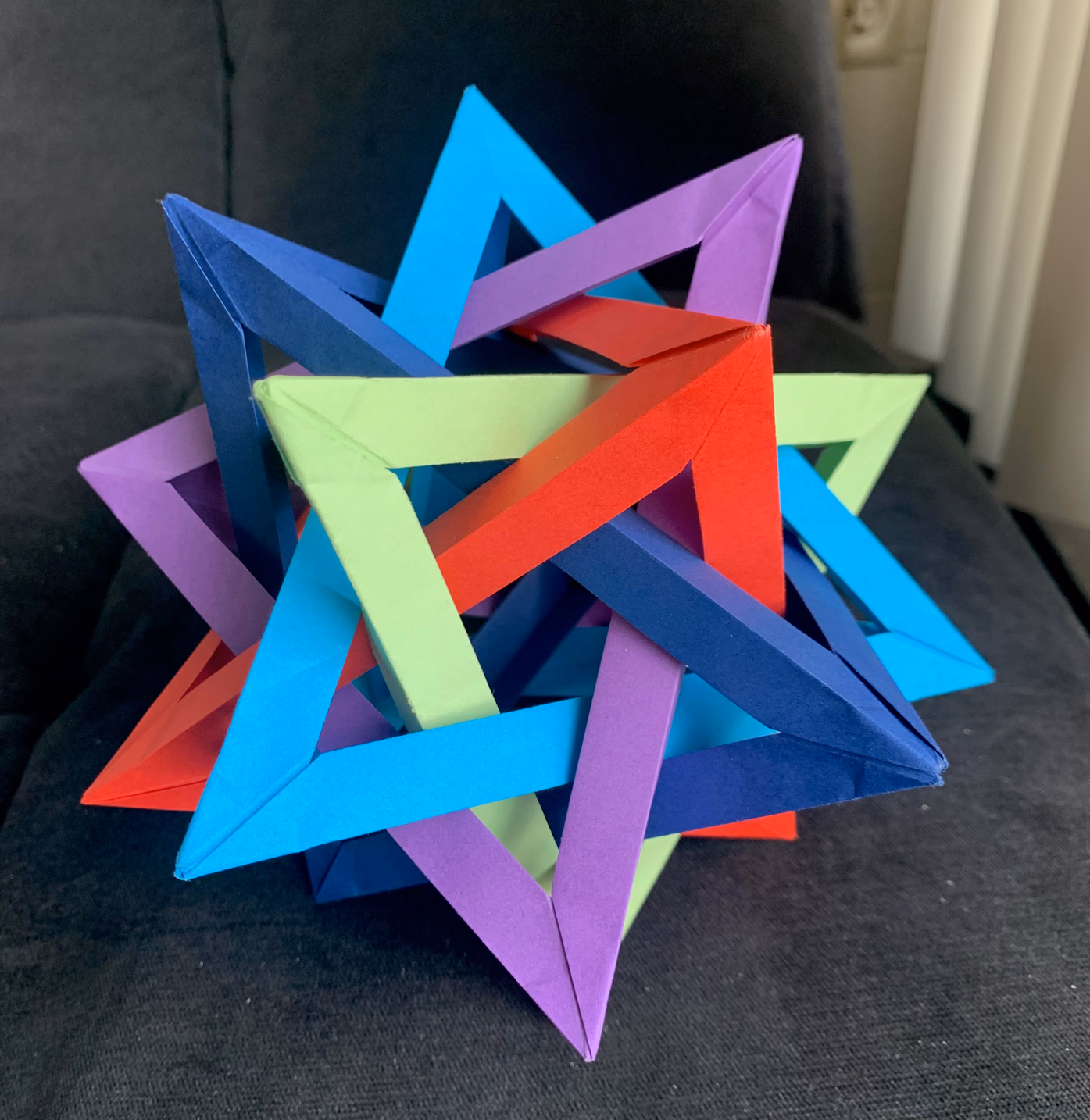 五个相交四面体和正方体环都属于 modular origami,就是用一堆小模块来组装一个大结构。有一本书就叫做 Modular Origami Polyhedra ,Amazon 上给的封面就是正方体环。现在我已经整出正四面体和正六面体了,这里有正十二面体的教程。正二十面体的也有教程,正八面体可以不用 modular origami 做出来(教程,不过我还是喜欢 modular origami,但是没找到好看的),所以所有的正多面体都可以做出来了。