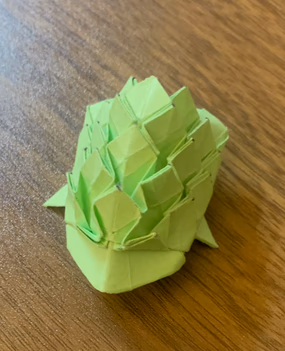 我看的 tutorial 是这个。但是在实际操作过程中,我觉得他折刺的过程可以改进:他的纸质量可能比较好,而且比较大,所以能够承受拉一下这个操作。我觉得一个更合理的方式是先把所有折痕折出来,然后再根据折痕折出刺的结构。稍微试一下就可以发现,折痕很好折,这样就避免了拉这个操作。还有一点需要注意的是:一开始找四分之一分界点的时候不要通过两次对折边来找,通过两次对折对角线来找会更好一些,因为接下来我们需要对一个 的正方形十六等分,这个要通过边对折来实现。如果两者都是通过边对折来实现,那么第二次的边对折被第一次边对折影响,找错了边就很尴尬(亲身经历)。