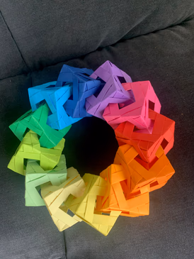 我是在这里找到的一个正方体的教程,在这里看到的最后整体效果图。这个看起来没有五个相交四面体那么炫酷,但是看起来更和谐。更重要的是,这个作品耗费的体力远比五个相交四面体要大:五个相交四面体总共要折 个相同的模块,但是这个作品需要 个相同的模块,折完实在是累死了,但是也有很高的成就感。这个作品中有两种自锁结构:一个是这个环自己就是个锁,另外正方体的每个角也是一个自锁结构。正方体角的自锁结构比四面体的自锁结构要稳固一些。