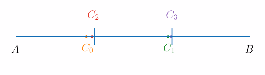方法三:迭代解。不妨设我们想要三等分 。于是我们先随便找一个初始解 ,然后 为 中点, 为 中点, 为 中点, 为 中点这样一路迭代下去。可以证明这个迭代是线性收敛的,所以初始的时候随便估一估,迭代几次就好了……