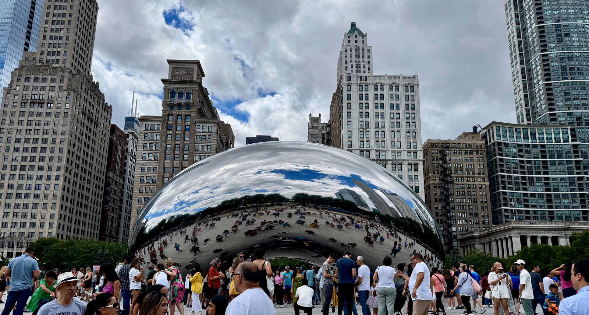 中午我们吃的 HaiSous,这可是我在芝加哥最喜欢的越南餐厅。吃了啥没啥印象了,只记得来的路上在讨论某人的冲击 x 猜想荣获 x 奖项的沉淀人生了。吃完饭后我和 cls、脸哥还有 jzp 去了 Millenium Park,准备看看芝加哥的地标,大豆子 Cloud Gate。说来也巧,昨天和 pty 来 Millenium Park 的时候,这大豆子还被围了起来没有开放,但是功夫不负有心人,脸哥不停地刷小红书,终于刷出了 Cloud Gate 重新开放的消息,这才得以让我们参观一下。Cloud Gate 我去过挺多次的了,但是这次 Cloud Gate 翻修后更光滑了。