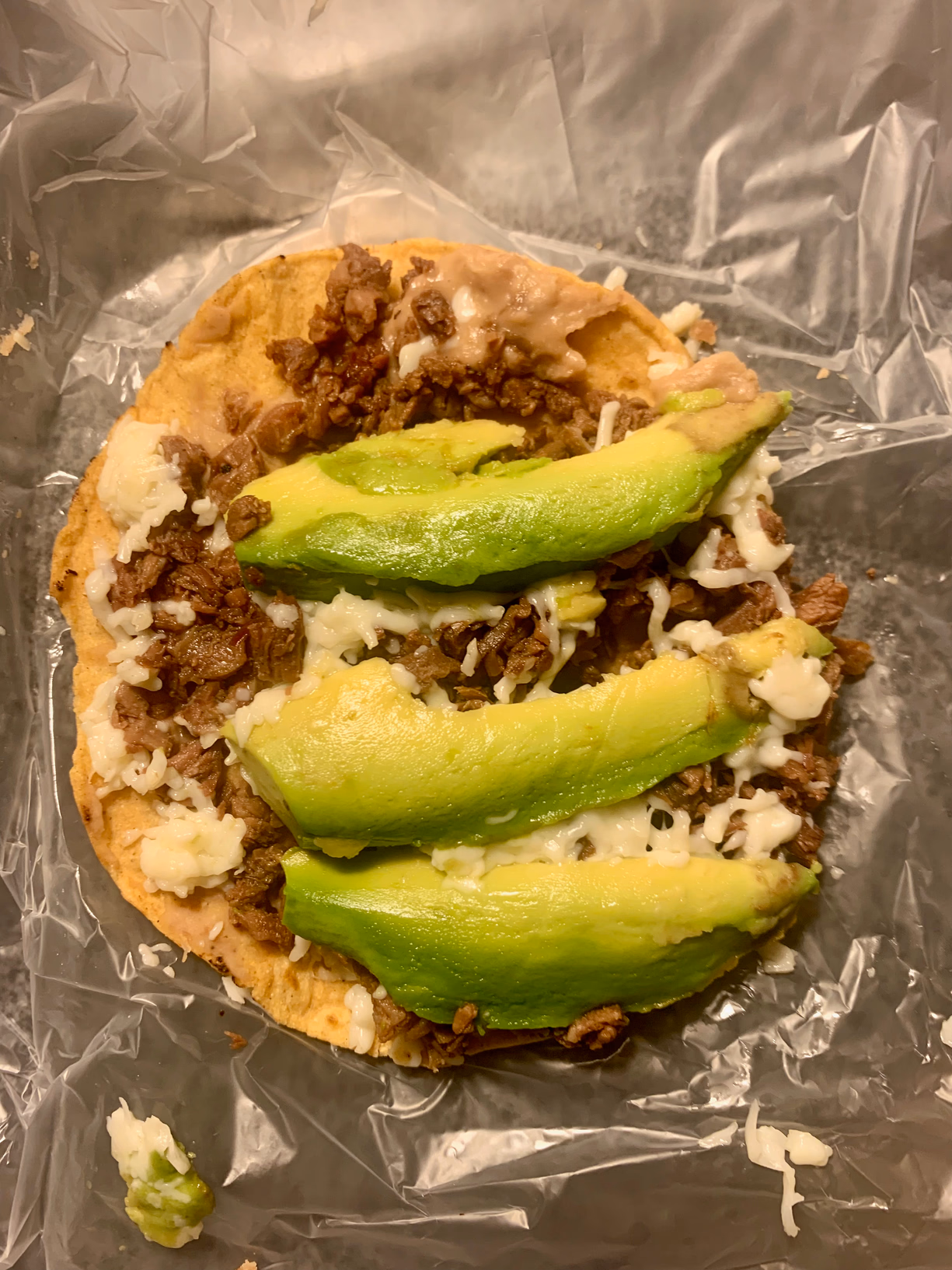 至于晚上吃什么……本来想安全起见,继续吃拉面的,后来想到一来这边拉面不咋地,二来我还没吃到好吃的 taco 呢,决定继续探索一发。我之前点的 taco 不太爽的一点是吃起来太干了,这次我就挑了一个带牛油果的,来自于 Tacos El Buey 这家店。这次的 taco 吃起来简直太爽了!这是我吃过的最合我口味的 taco 了,照片如下: