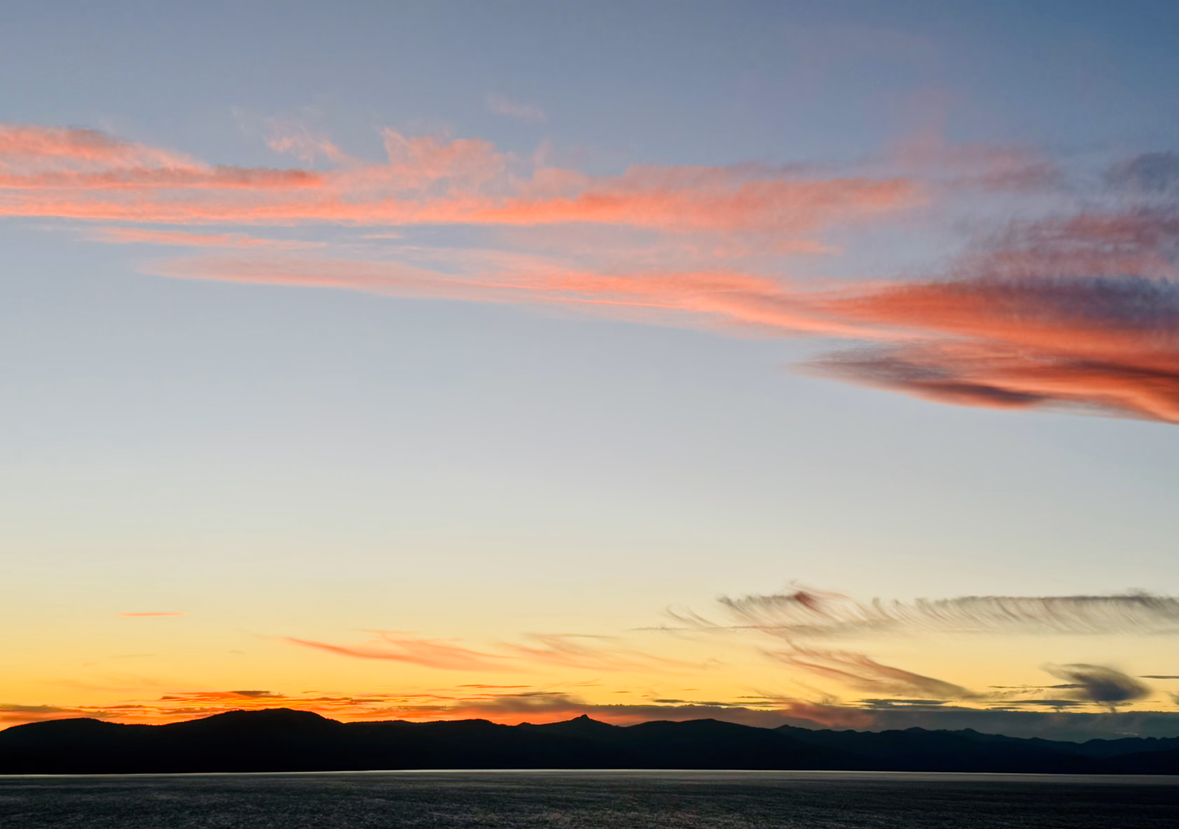 Cave Rock 那边不是很好停车,我们几个人先下车之后有人去停了车。Cave Rock 那里一堆大石头,坡度不小,手脚并用才好上去,幸亏这里石头很实,踩上去不会晃悠。由于就在湖边上,拍的日落还挺好看的。刚日落的时候云是灿烂的金黄色,太阳落下去后云变成了赤陶色,甚至有种不真实的模糊感。lzy 和 tjc 来的比较晚,想爬上去的时候已经比较黑了,担心安全就没上去了,特别是下山比上山还危险。