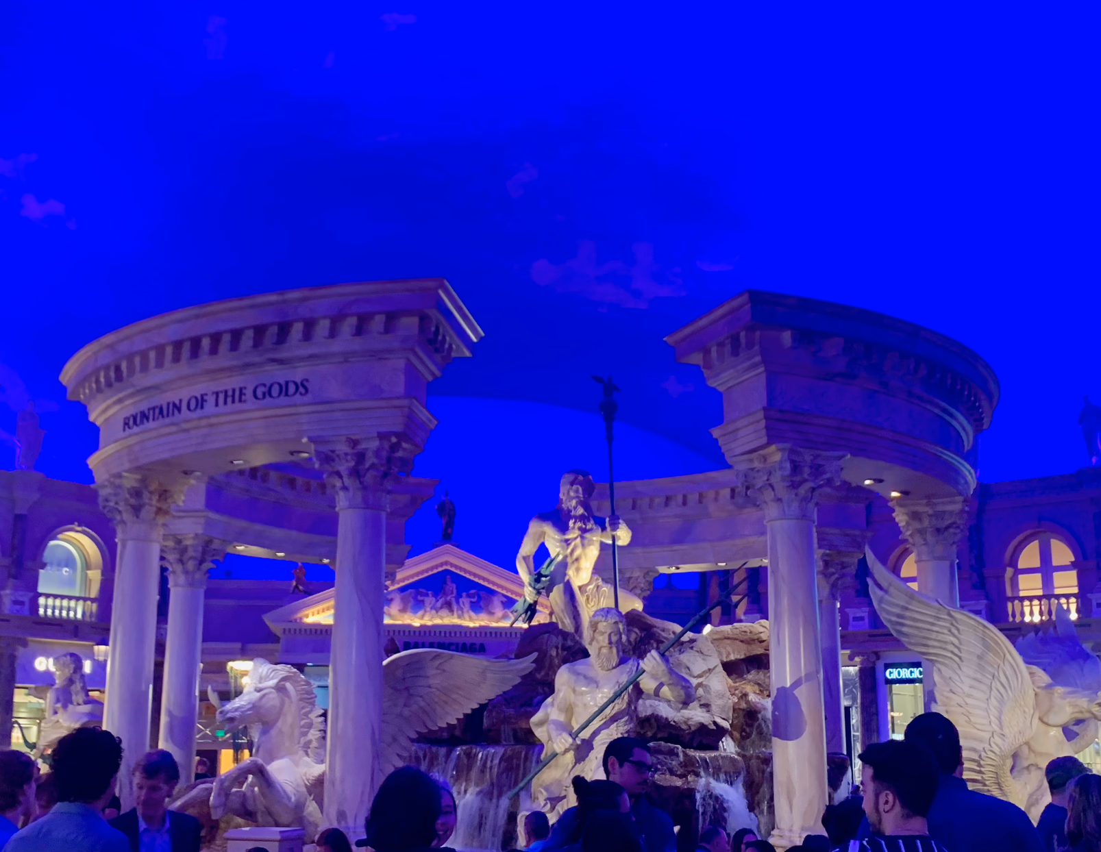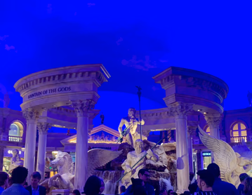 之后逛了一下 Caesar’s Palace,另外一个大酒店,装饰风格又是极尽奢华。酒店二楼有个 Fountain of the Gods,里面有若干希腊众神的雕像。根据我 300h 的 Hades 经验,我大概猜出了有哪些神:最上面显然是雷神 Zeus,持三叉戟的是海神 Poseiden,拿把弓的应该是猎神 Artemis,拿盾的应该是智慧女神 Athena,Athena dash 天下第一!……不好意思 Hades 打多了串台了。还有一个女神不知道是啥,盲猜一个爱神 Aphrodite……