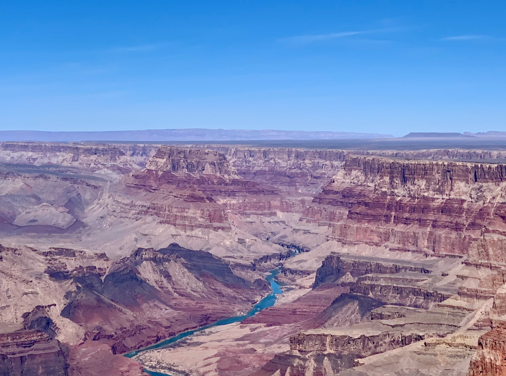 起床之后就看了 Desert View,是 Grand Canyon 自驾路线。昨天去的那几个 points 有官方大巴可以去,风景和昨天看的还是没啥区别,但是这里可以把 Colorado River 照进来。没错,那条绿色的一点也不起眼的小河就是 Colorado River。很难想象这么一条小河居然能雕刻出这么宽广的 Grand Canyon。